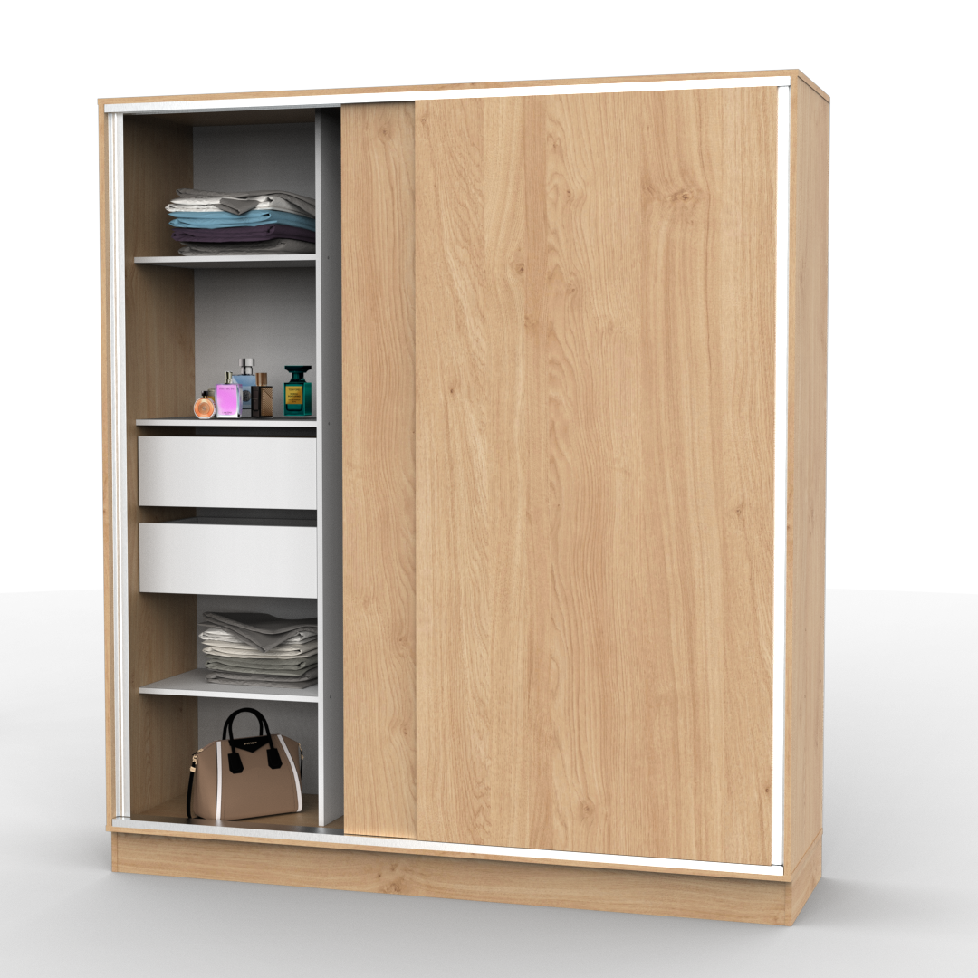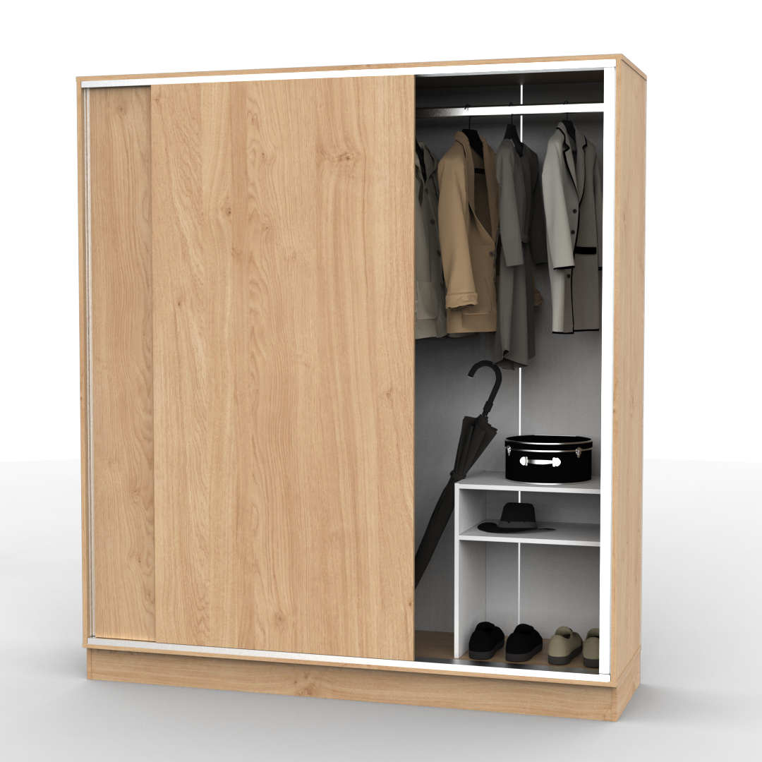 Está compuesto por dos puertas correderas con herrajes de última tecnología que brindan un buen movimiento y en su interior cuenta con estantes, cajones y un amplio perchero.
